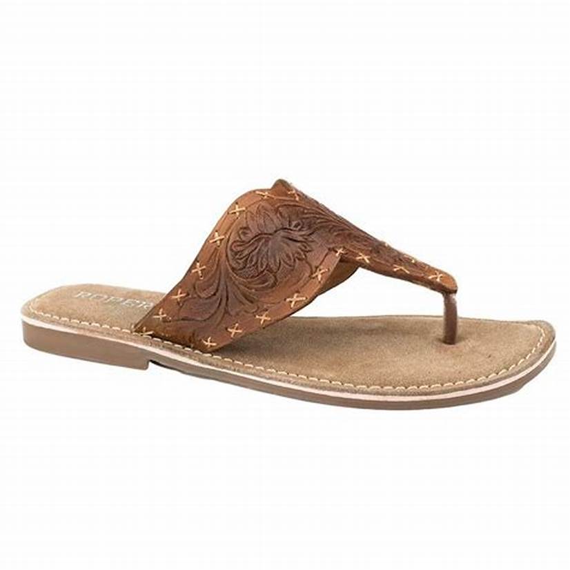 09-021-0607-2528TA Roper Women's Juliet Hand tooled Leather Thong Tan