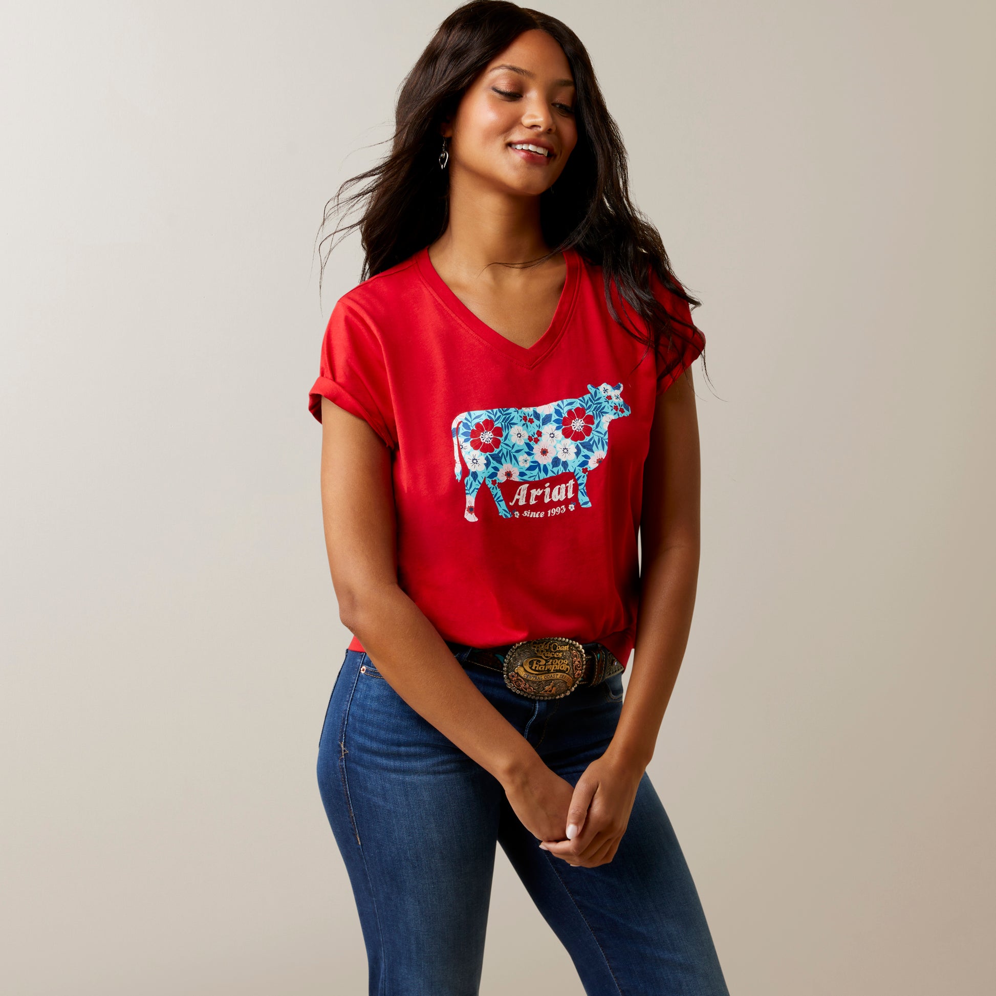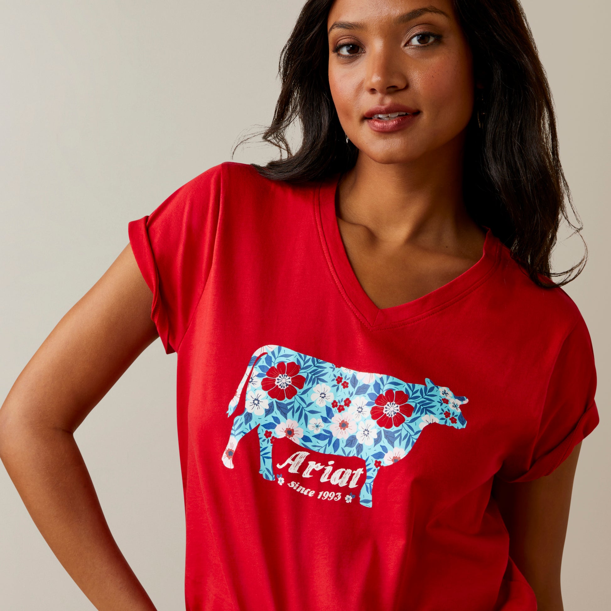 10045086 Ariat Women's Flower Cow SS Tee Equestrian Red
