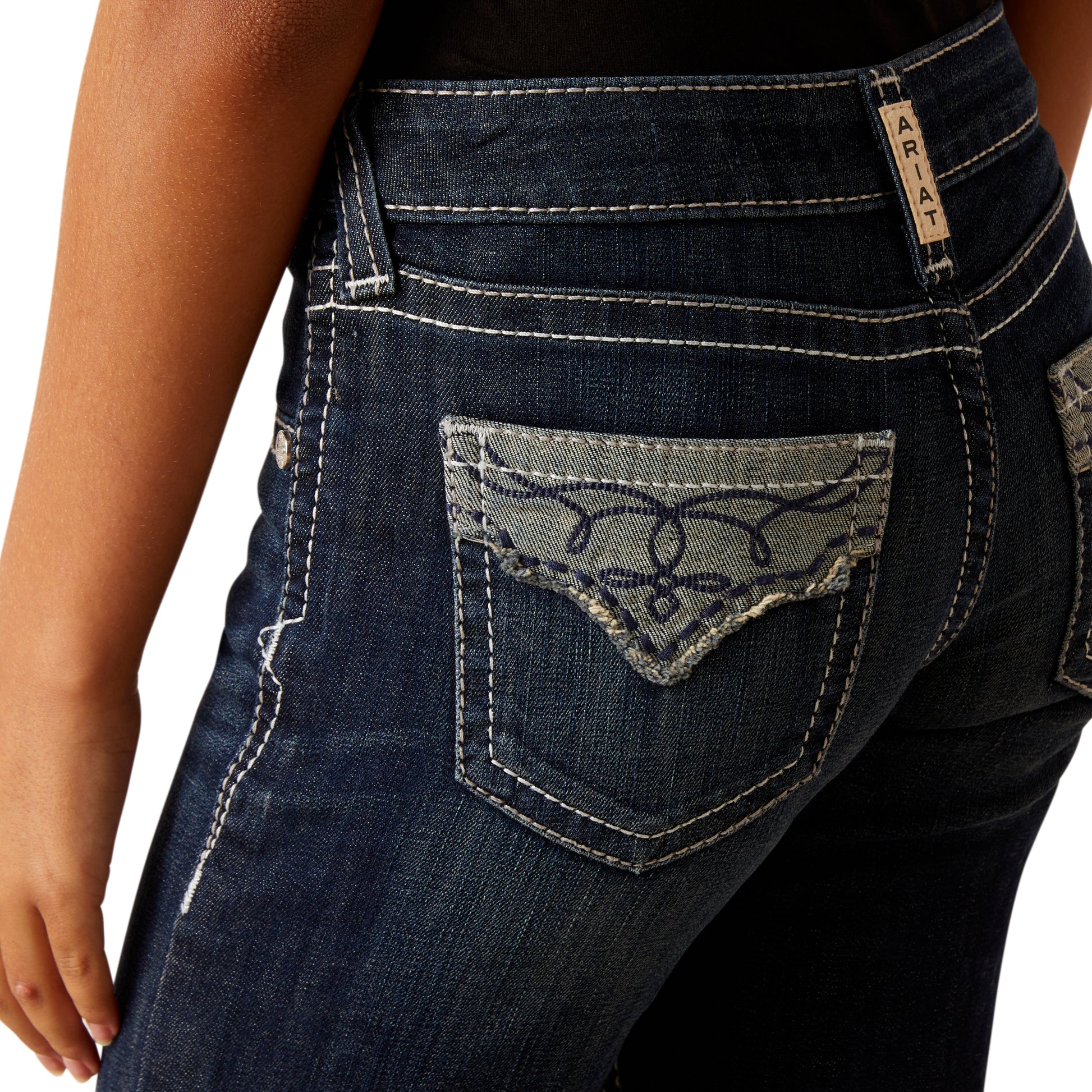 Durable enough for every day but dressy enough for special occasions, this trouser comes in a dark wash with pops of white stitching. She'll love showing off the back pocket (a mix of reverse denim, raw-edge details, and Western embroidery).