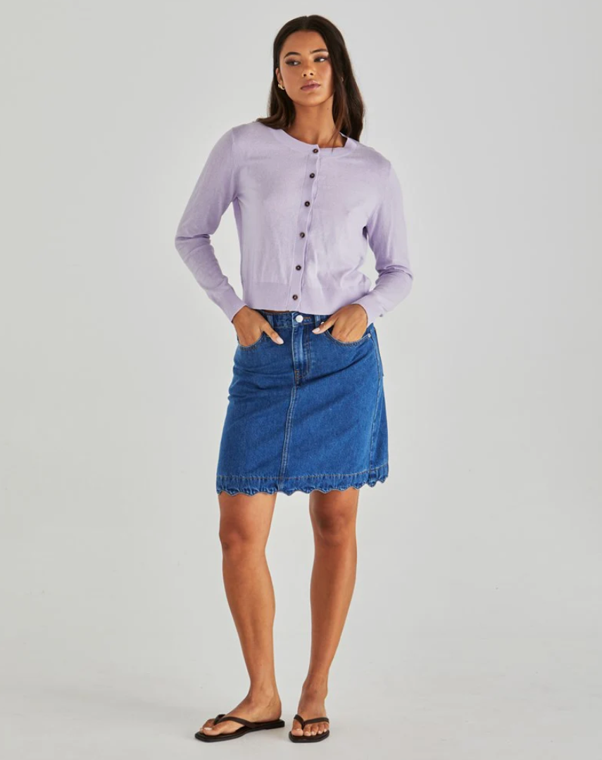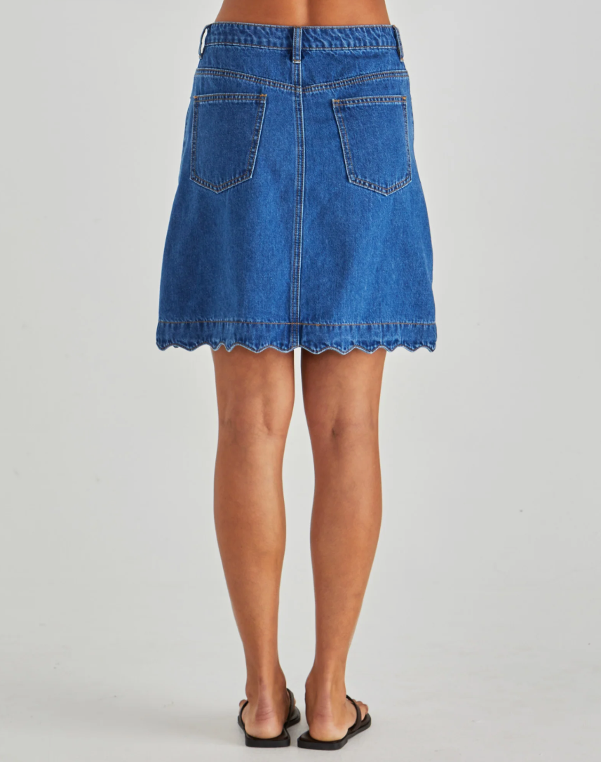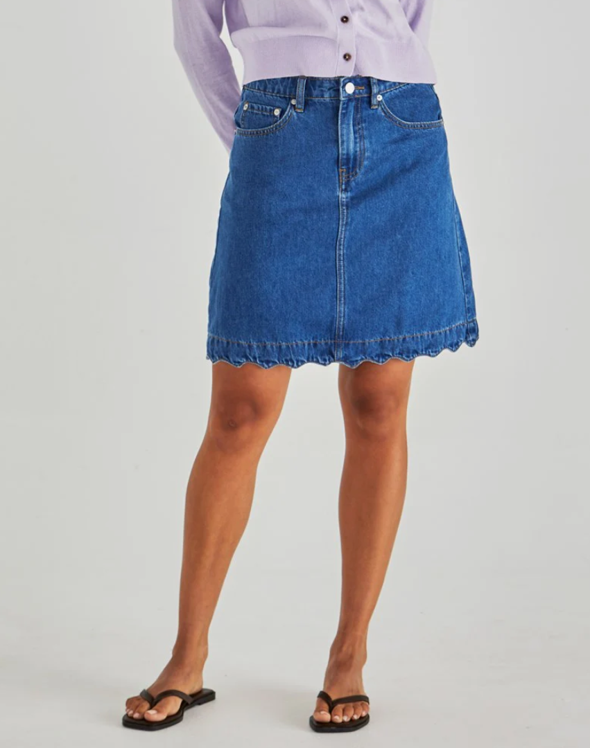 The Vale Denim Skirt blends classic shape with scalloped hem detail for a playful twist. Soft and easy with pockets and belt loops, it’s a fresh take on everyday denim.