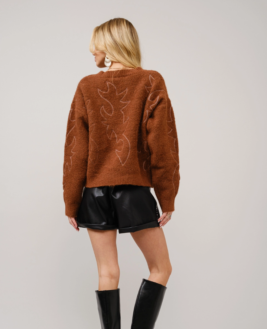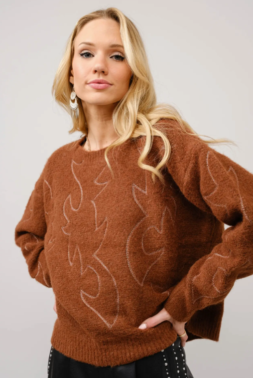 A cozy crew neck sweater featuring a unique western boots stitch pattern, perfect for adding a touch of style to your wardrobe. Crafted from a soft and warm fabric blend.