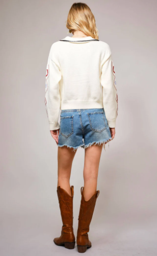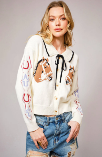 Whimsical button-up cardigan featuring horse face graphics, cowboy-inspired sleeve patterns, and a Peter Pan collar with velvet ribbon tie. 50% Viscose 28% Polyester 22% Polyamide Model is 5'10" and wears a size Small