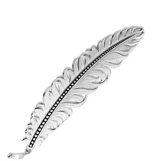 Stick a Feather in your hat! Montana Silversmiths completely innovative Hat Feather that with a little twist and flip will secure onto your hat band. Feathers are such a beautiful accent in any form to wear and this hat feather is no exception. Finished in a bright silver this feather was engraved to mimic the beauty and irregularity of a natural feather, with sections and little swirls that add character and interest for this piece. This classic hat feather is hand-painted a deep black down the main vane highlighting the line of microbeads down the shaft. The trademarked fastening system will secure onto most hat bands.
