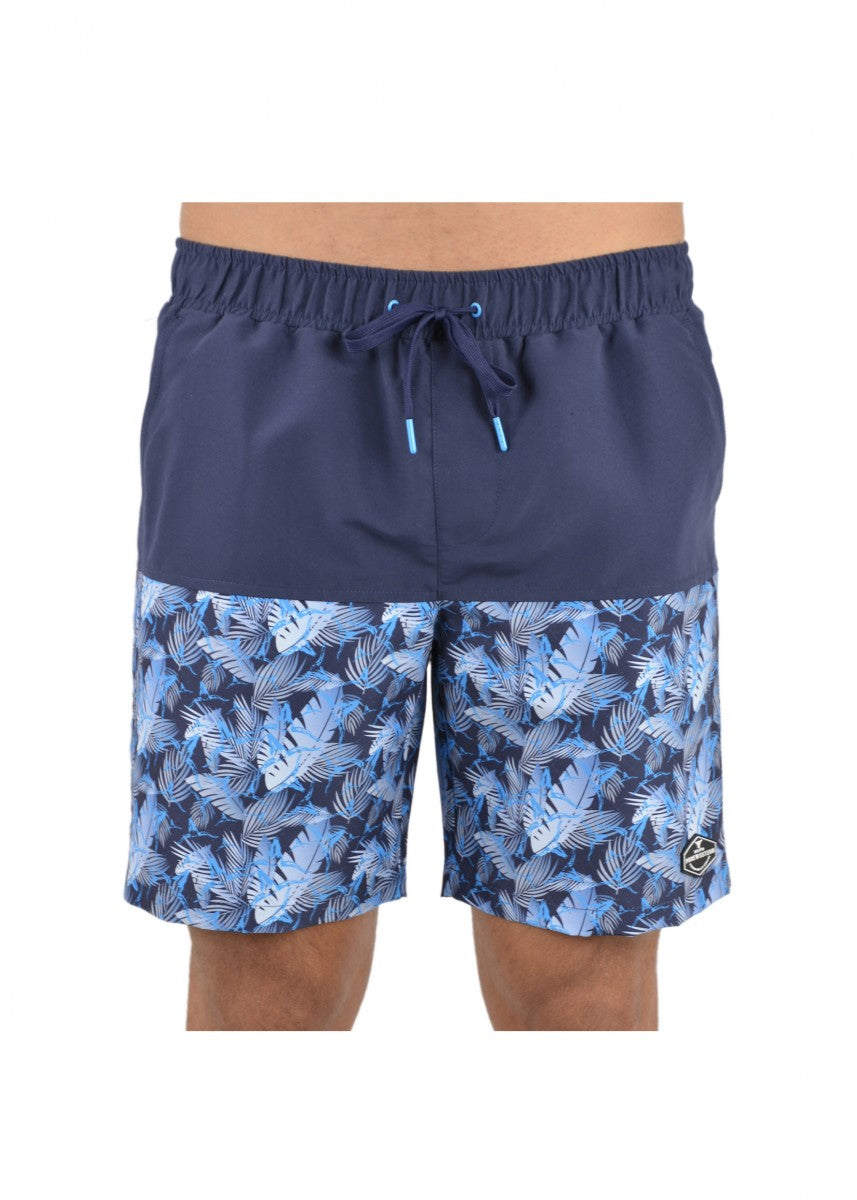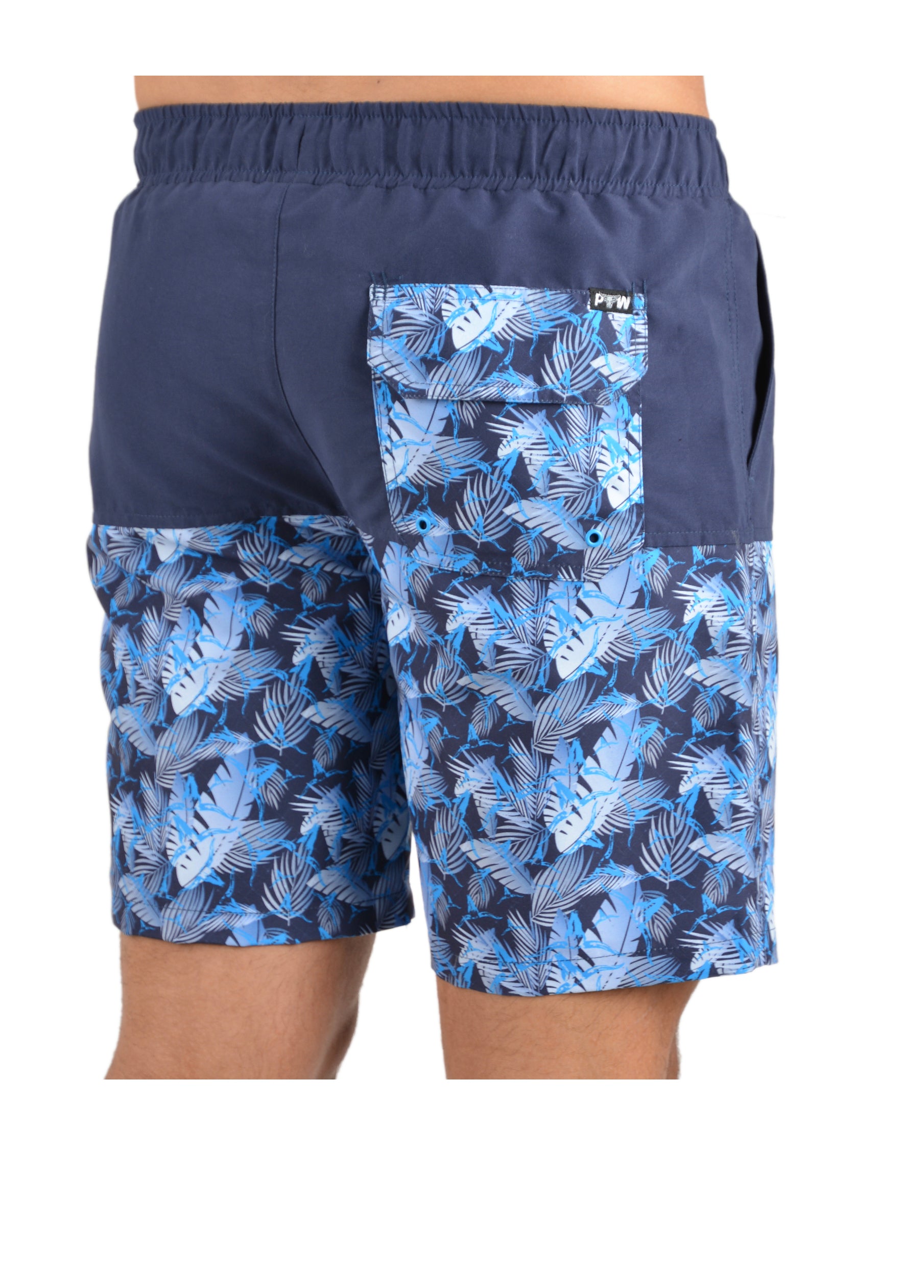 Features: Boardshort with elasticated waist, cut'n'sew panels with contrast yardage print, contrast waistband facing and back pocket with yardage print, drawcord tie with metal trims, back pocket with velcro closure and eyelets