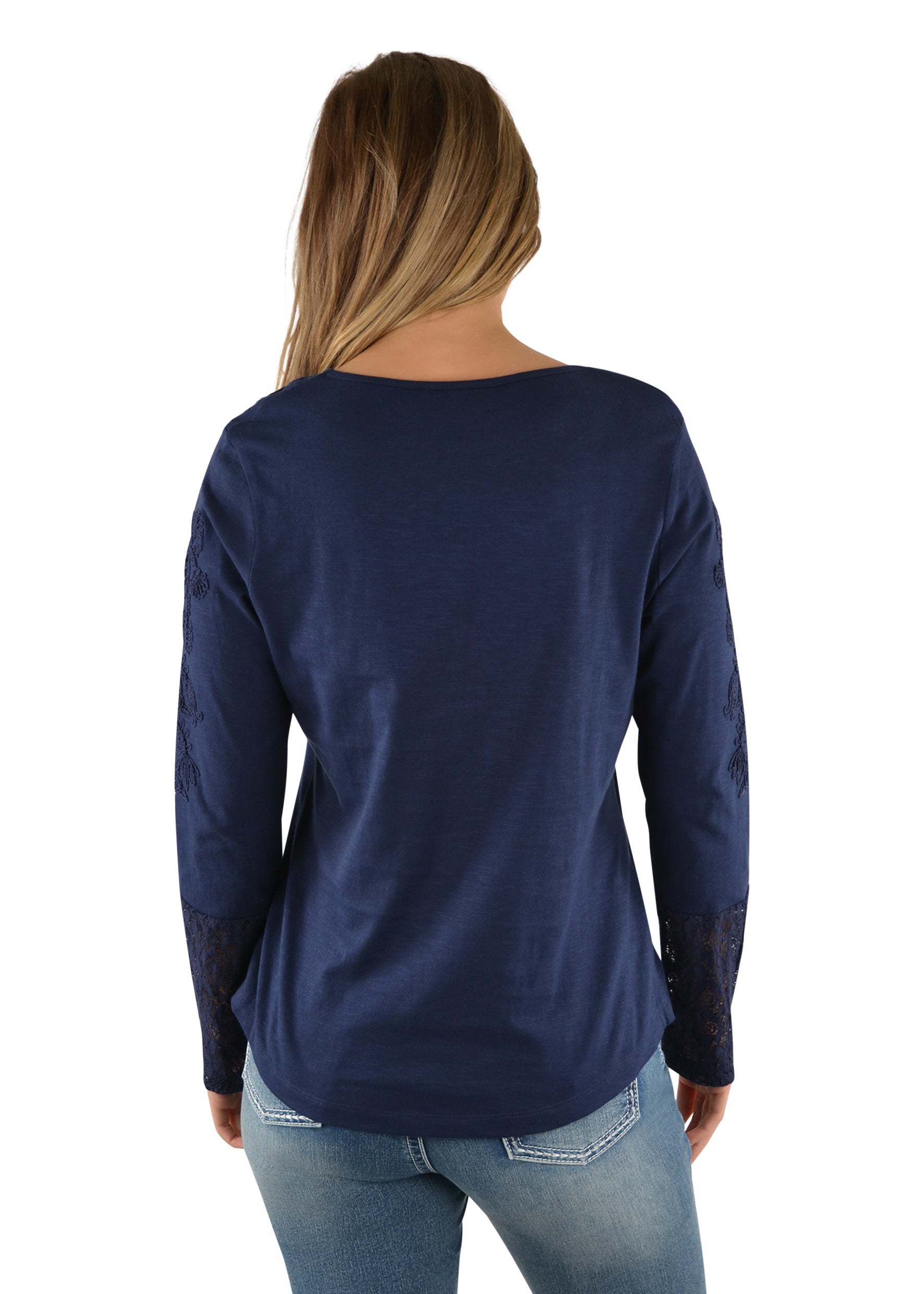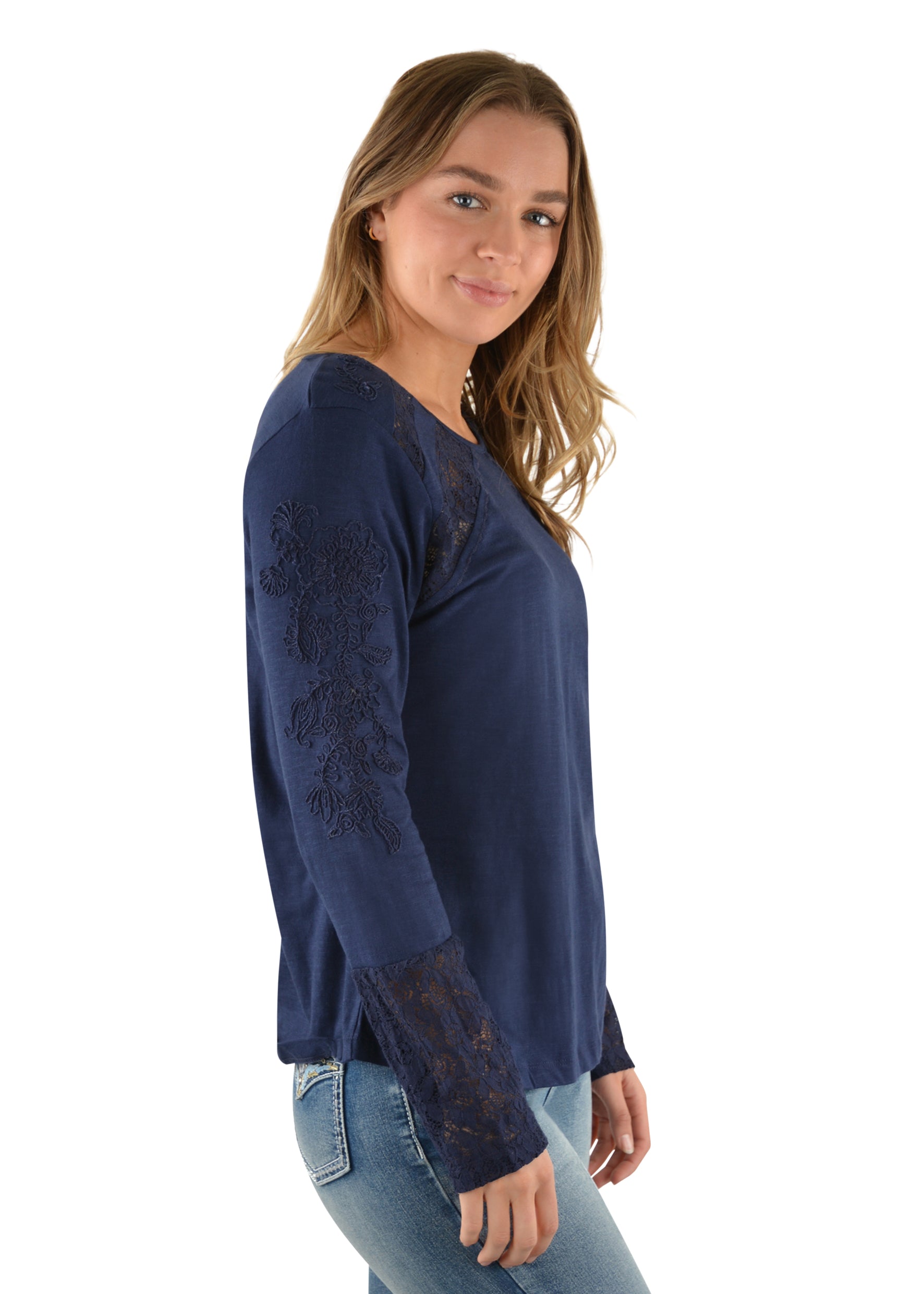 Features: Raglan top in textured jersey, lace yoke and sleeve panels, longer back hem, logo pip label at side seam, full sleeve embroidery details