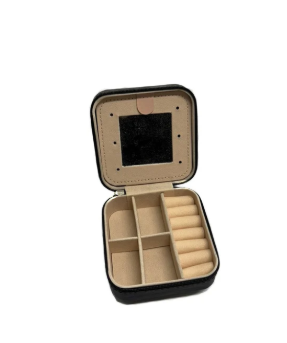 ORGANIZED INTERIOR : INCLUDES A MIRROR, EARRING HOLDERS, POCKET, RING SLOTS, NECKLACE HOLDER.