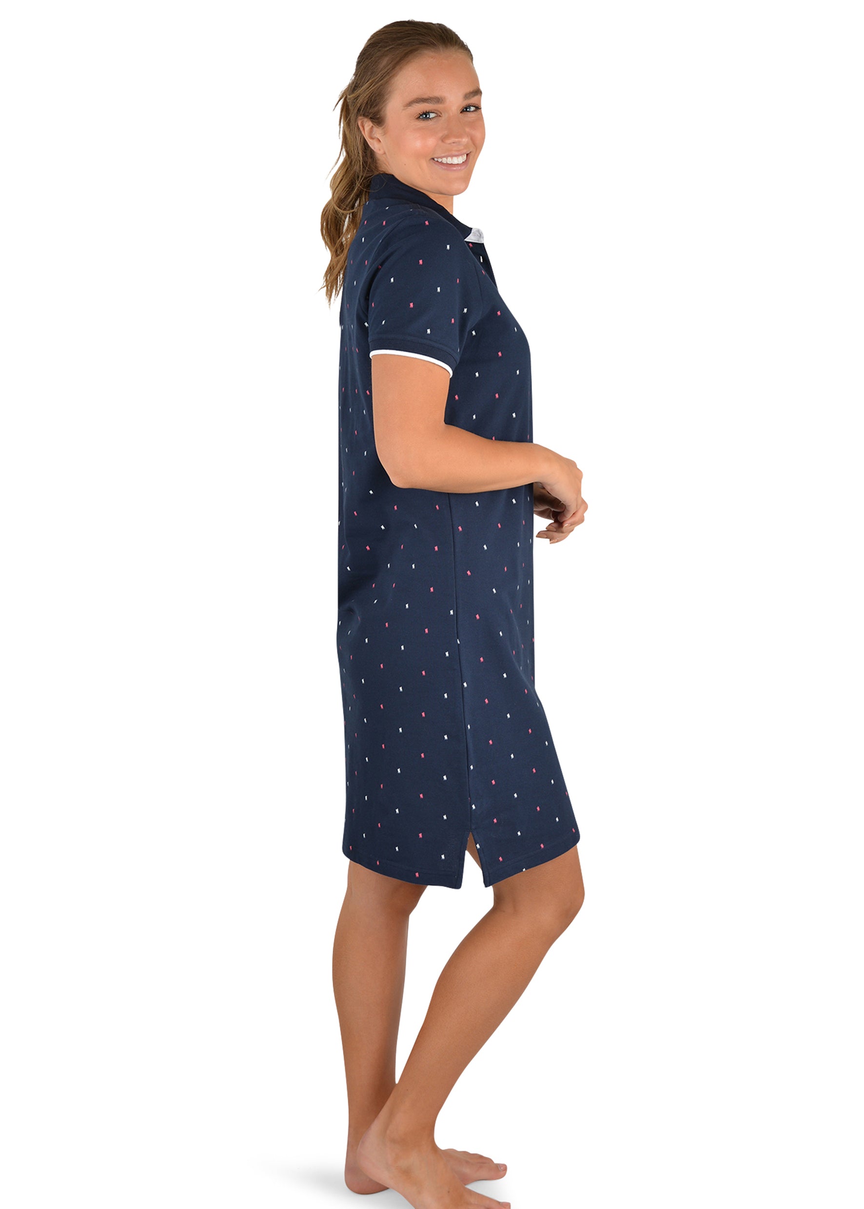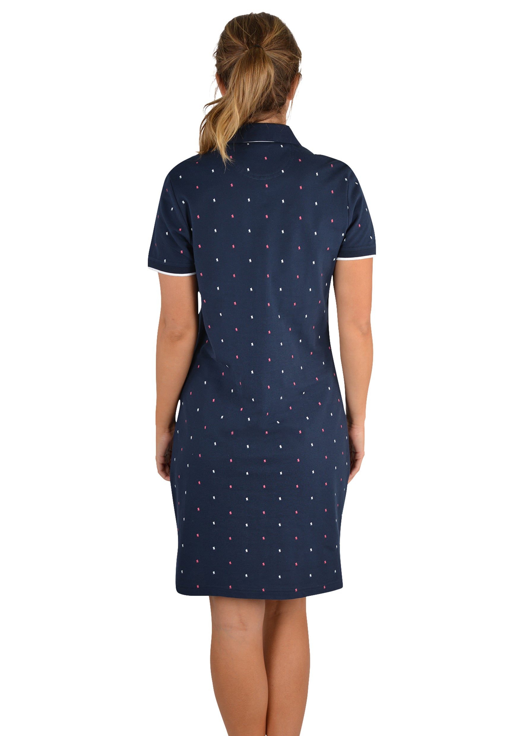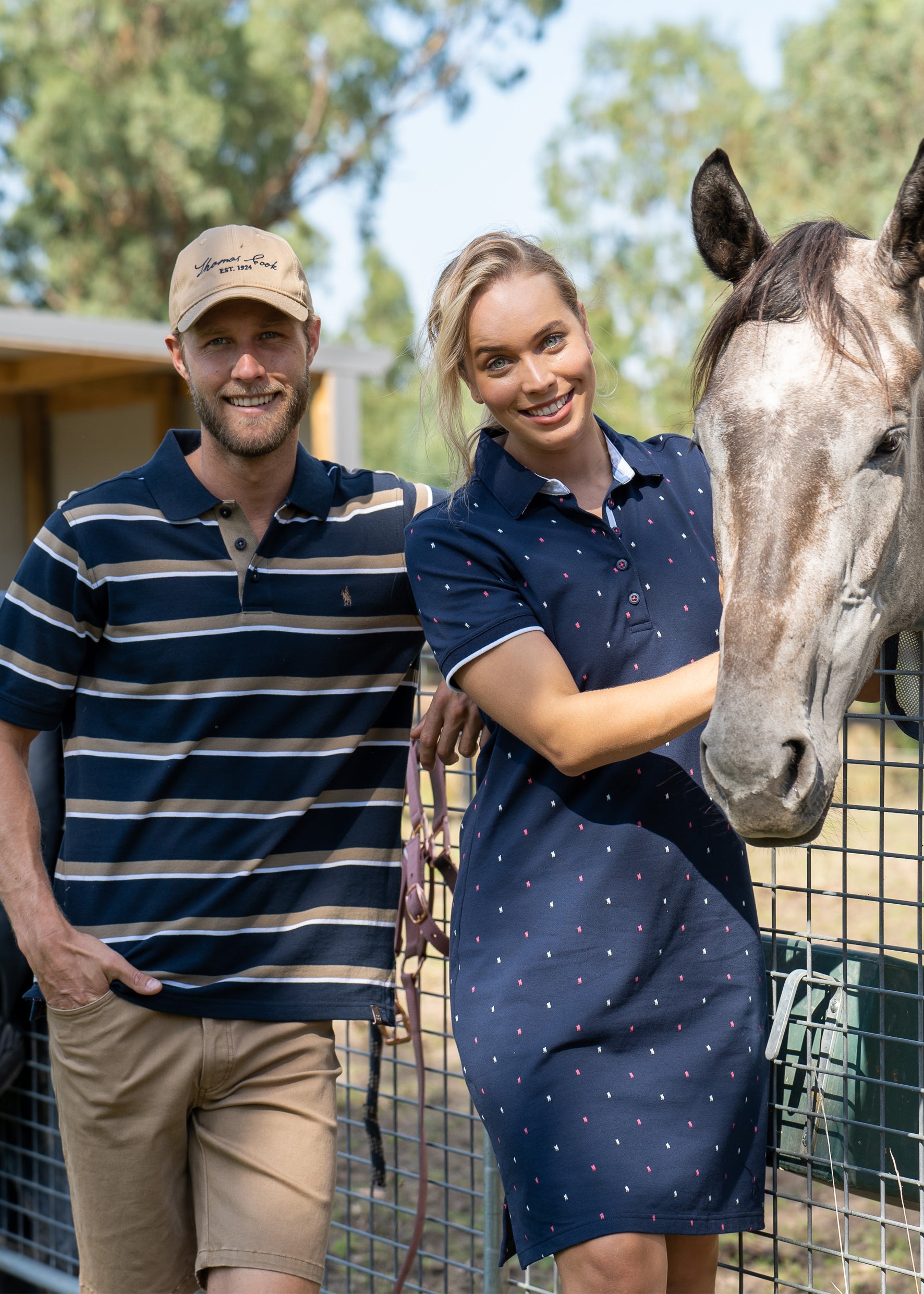 Features: Polo dress, Thomas Cook original horsemen print, rib cuffs with contrast tipping, drill collar, stripe trim, grosgrain trim, chambray trim, horseman embroidery on chest, stretch for comfort and movement