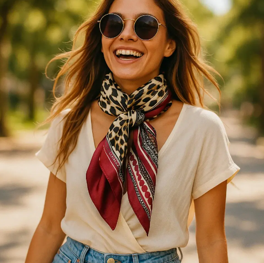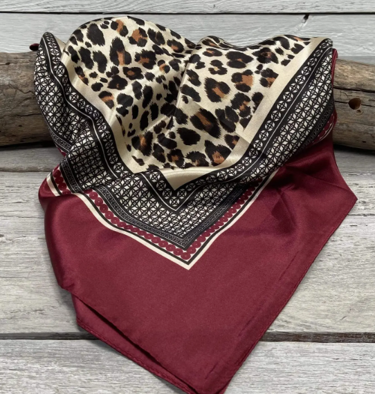 Our classic wild rag/scarf in a leopard print with a wine border. It is a square and measures 35" x 35". It is sure to add a bright pop of color to any outfit. Western or Crystal slides available to accent 100% machine washable polyester, silky and soft.